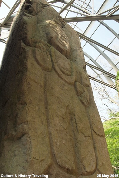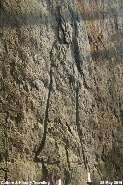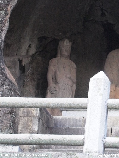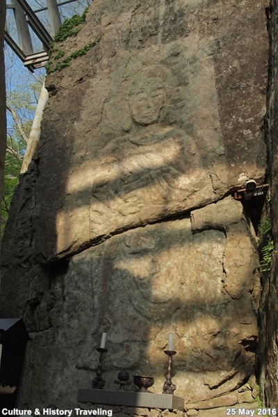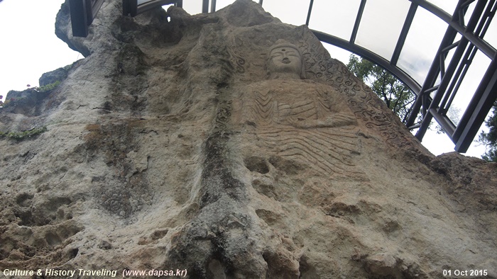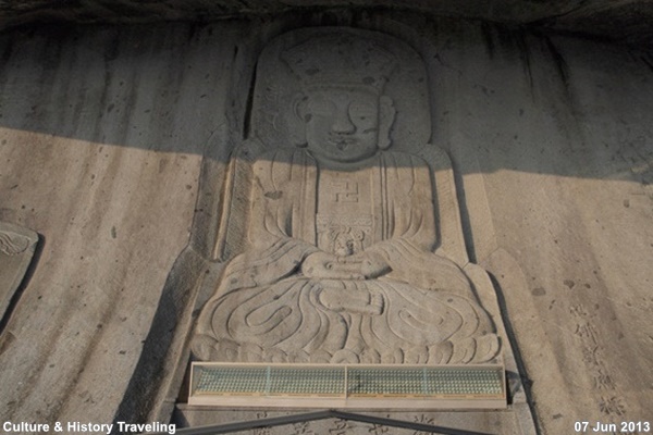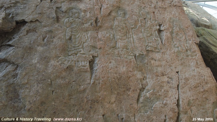 남쪽벽에 새겨진 보살입상. 특별한 설명이 없으나 이곳에서는 지장보살으로 보고 있다. 옆에 신선사를 조성한 내력을 적은 400여자의 글자가 새겨져 있다.