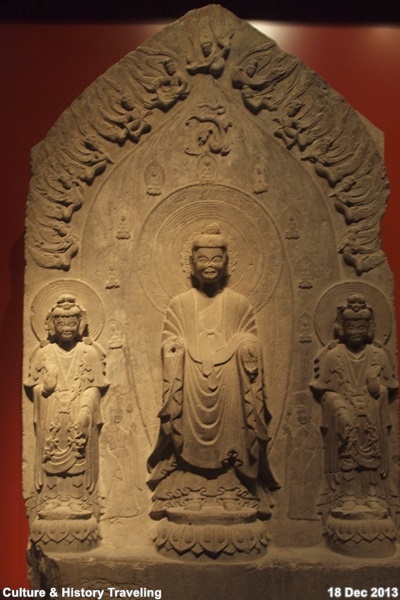산동성 칭저우시 출토된 불상이다. 북위 정광6년(525) 가지연(贾知渊)이라는 사람이 만들었다고 기록된 삼존불상이다. 광배가 있는 삼존상으로 ‘백제의 미소’로 잘 알려진 서산마애삼존불입상과 비슷한 형태를 하고 있다. 광배 주위에 비천상이 새겨져 있다. 산동지방과 백제의 교류관계를 보여준다.