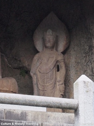 주존불 왼쪽편 암벽에는 여래입상과 반가사유상이 있는 삼존불상이 얕게 새겨져 있다. 반가사유상을 제외하고는 주존불을 안내하고 있는 듯한 손모양을 하고 있다. 그 아래에 모자를 쓰고 공양을 올리는 공양상 2구와 승려를 새겨 놓고 있다.